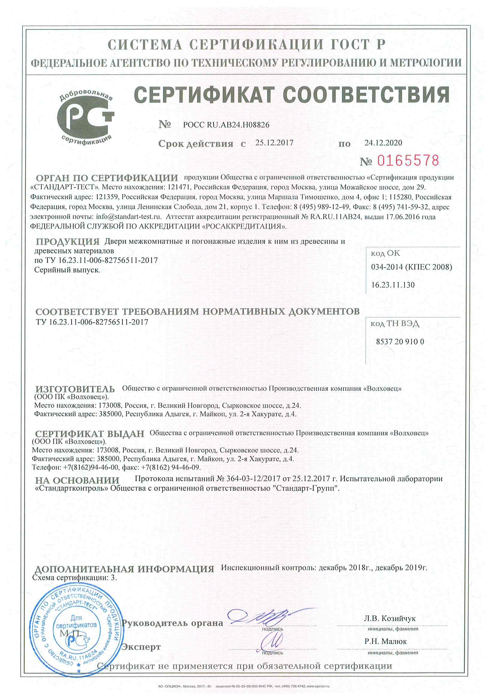 • Сертификат соответствия Двери межкомнатные и погонажные изделия в различных отделках и облицовочных материалах. До 14.03.2022